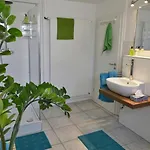 A Schoenes Ferienhaus Mit Garten In Friedrichshafen Am Bodensee külön WC-vel és zuhanyzóval ellátott fürdőszobát biztosít. A kényelmes tartózkodásért szárító és törölközők is biztosított.
